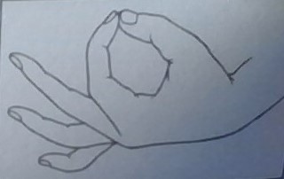 Sedetevi o sdraiatevi. Ora circondate il dito indice destro con le quattro dita della mano sinistra, lasciando il pollice teso in mezzo al palmo destro. Chiudete gli occhi.