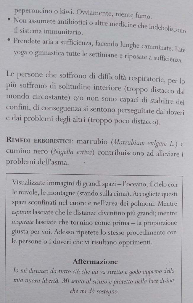 Quali vantaggi secondari mi sta offrendo questa malattia? In ogni situazione c’è un vantaggio, una malattia ci presenta finalmente l’occasione di riposare, di farci coccolare dagli altri, di ricevere cura e simpatia, di affidare le responsabilità a qualcun altro, eccetera. Dobbiamo quindi permetterci di ricevere affetto, simpatia e riposo nelle giuste proporzioni, senza aspettarci nulla dagli altri. È dunque possibile modificare qualche abitudine in modo da ottenere “i vantaggi della malattia”.