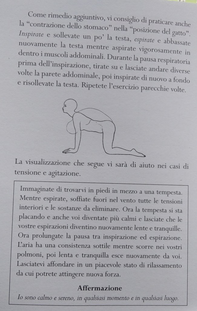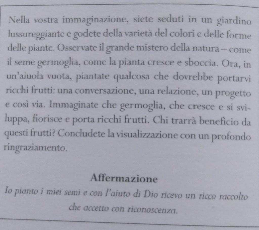 Siete seduti di fronte a un campo e osservate le spighe di grano che ondeggiano. Quando inspirate, le spighe si muovono verso di voi, quando espirate si allontanano. Qualche volta vedete l’intero campo, a volte soltanto le singole spighe. Vedete anche che lo spazio diventa più piccolo quando inspirate, più grande quando espirate. Le spighe gialle indicano la transitorietà, la grande morte che è già contenuta nel seme di un nuovo inizio. Dopo un po’, osservate la vastità del cielo azzurro attraversato dalle nuvole, poi guardate all’interno, nella sicurezza del vostro cuore. Ora osservate pensieri che vanno e vengono, soffermatevi un attimo esaminandoli. Come pensate per la maggior parte del tempo? In modo positivo, negativo, fiducioso, timoroso, preoccupato, critico, dominato dai ricordi del passato o dalle aspettative per il futuro?