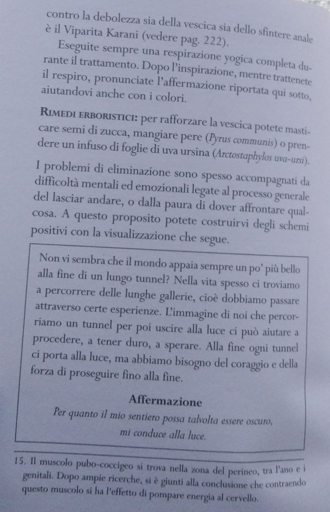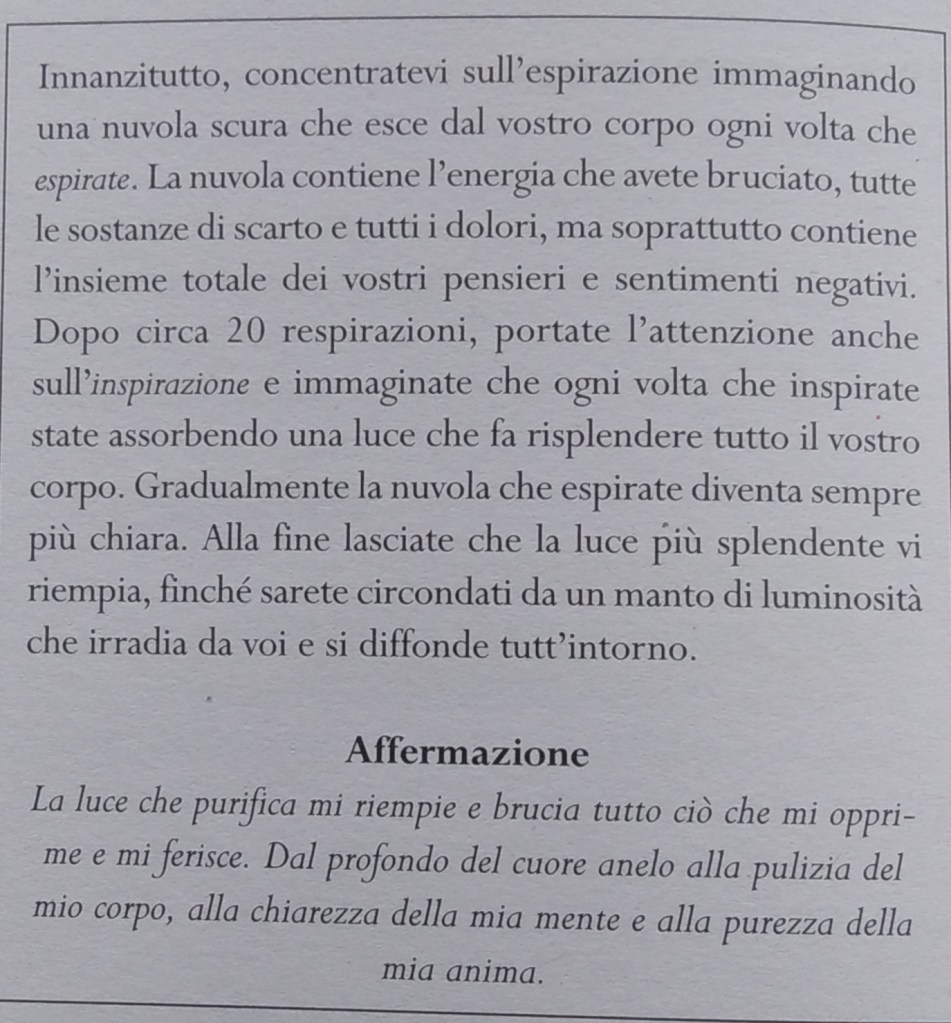 Concentratevi su una parte del vostro corpo che è debole o malata. Ora immaginate che una luce stia ardendo nel baricentro del vostro corpo all’altezza dell’ombelico. Ogni volta che espirate, dirigete i raggi di luce verso quella parte del corpo. Prima lasciate che grandi nuvole scure di fumo (le cose che vi fanno stare male, il dolore, eccetera) fuggano dalla parte del corpo che state illuminando. Poi concentrati esclusivamente sulla luce che lentamente riempie, illumina e guarisce quella parte del corpo.