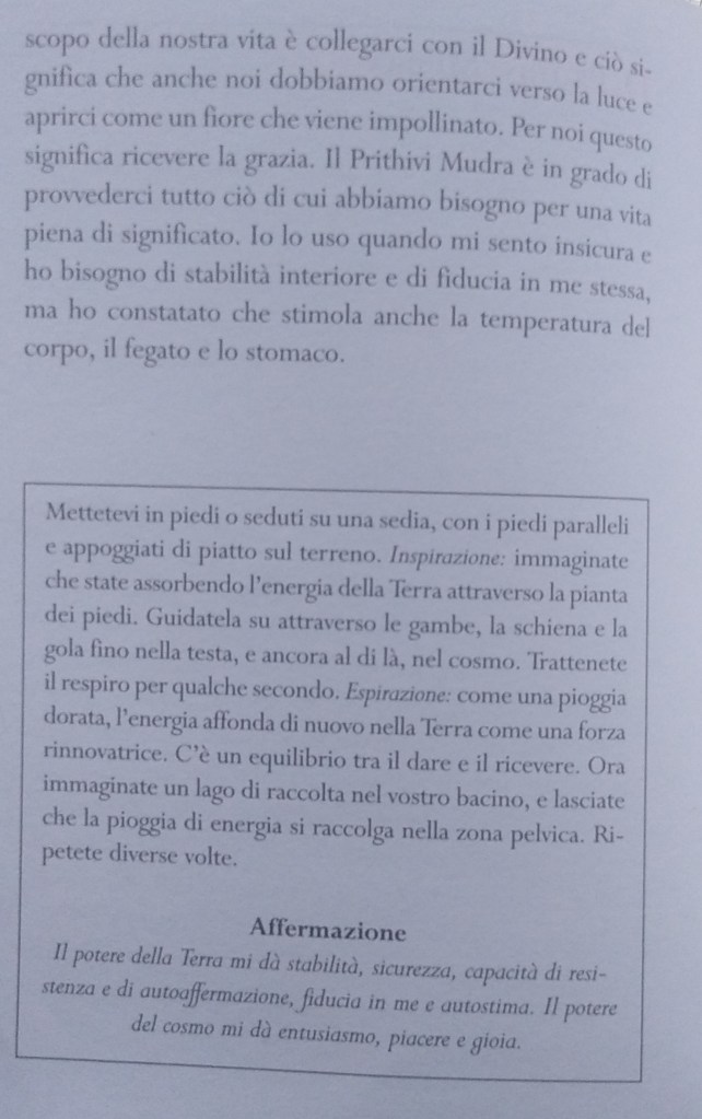 Sedetevi o sdraiatevi. Ora circondate il dito anulare destro con le quattro dita della mano sinistra, lasciando il pollice teso in mezzo al palmo destro. Chiudete gli occhi. Immaginate la nuda terra e pietre frantumate in tutte le forme possibili, deserti, montagne, isole. Che cosa succede quando le masse di terra cominciano a muoversi? E quando la terra si asciuga e viene completamente esposta al sole? Ora immaginate la terra fertile. Lasciate che la vegetazione si manifesti lentamente, piante piccole, piante grandi, alberi, molto verde. Ora concentratevi su un unico seme che riposa profondamente sepolto nella terra. Con ogni respiro, qualcosa si muove all’interno affinché il seme esploda e un germoglio si allunghi in direzione della luce. Allo stesso tempo, il seme mette radici verso le profondità della terra, diventa un albero che cresce, molto lentamente. Aspettate pazientemente osservando la pianta che si sviluppa fino a raggiungere le dimensioni adulte. Il tempo non ha significato, conta soltanto la crescita costante. L’albero fiorisce nuovamente ogni anno e porta frutto. Come l’albero, anche noi non sappiamo come e perché tutto questo succede; come l’albero, vogliamo offrirci completamente alla vita e sappiamo che ha un senso, anche se probabilmente non saremo mai in grado di sondare completamente il suo mistero. Mentre l’albero cambia, di anno in anno, anche il nostro sviluppo interiore continua e siamo noi a determinare che sia gioioso o triste. Continuate a tenere mano il dito per un po’, percependo il calore che scorre, poi circondate l’anulare sinistro e tenetelo in mano per qualche minuto.
