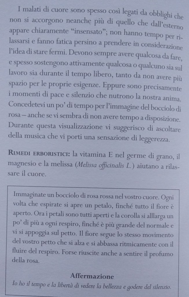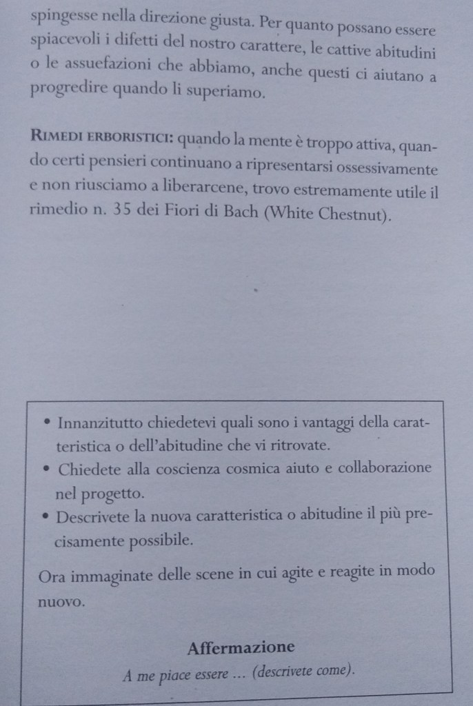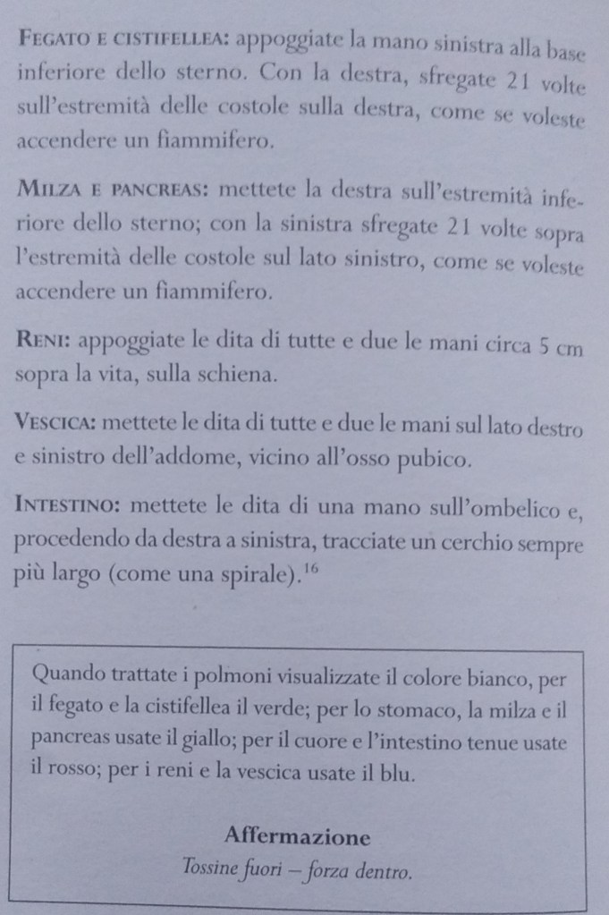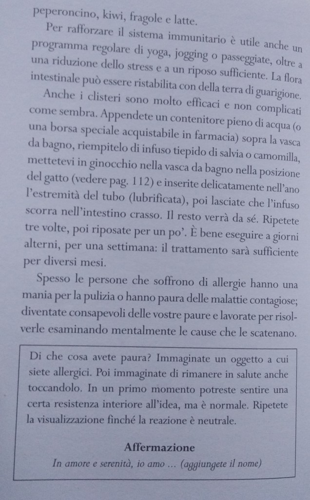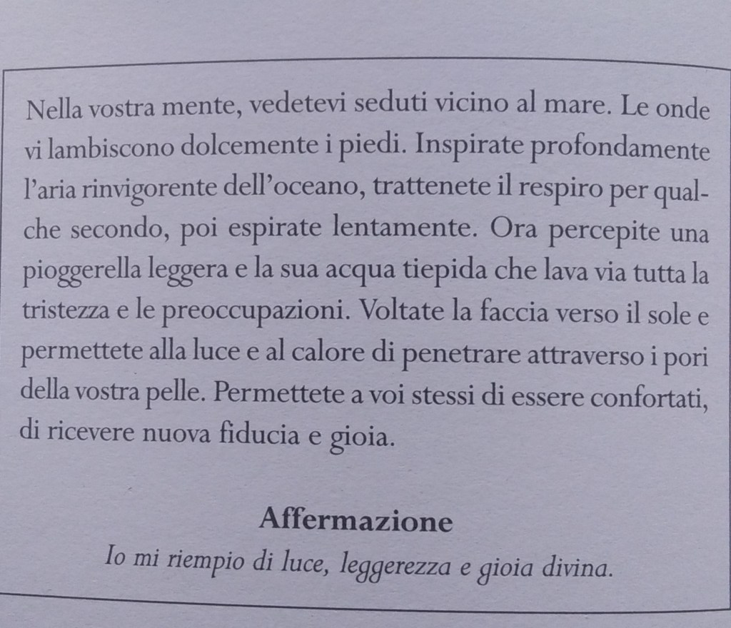 Dobbiamo essere disposti a lasciar andare tutto ciò che ci fa stare male. Gli sciamani dei popoli nativi cominciano sempre i loro rituali di guarigione scacciando gli spiriti cattivi. Considerate quello che vi fa star male: quali sono i pensieri, i sentimenti e le abitudini che minano la vostra salute? Siete pronti ad abbandonarli? Tuttavia non dimenticare l’amore, la cura e la comprensione per voi stessi: più sbagliate, più avete bisogno di amarvi.