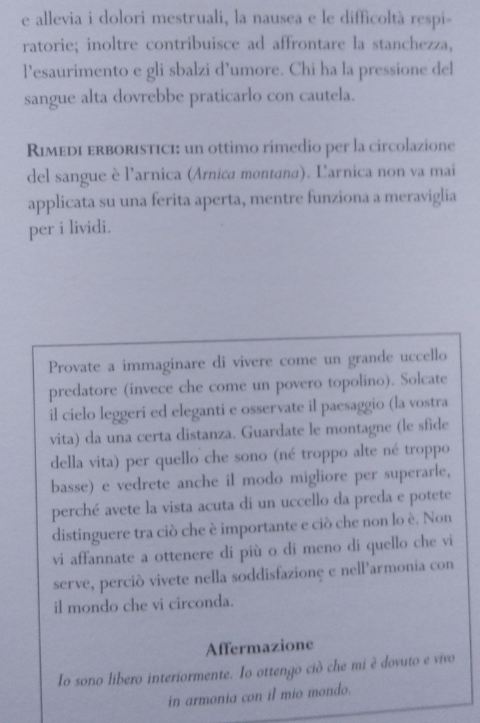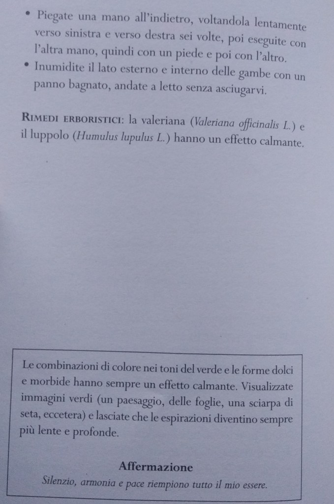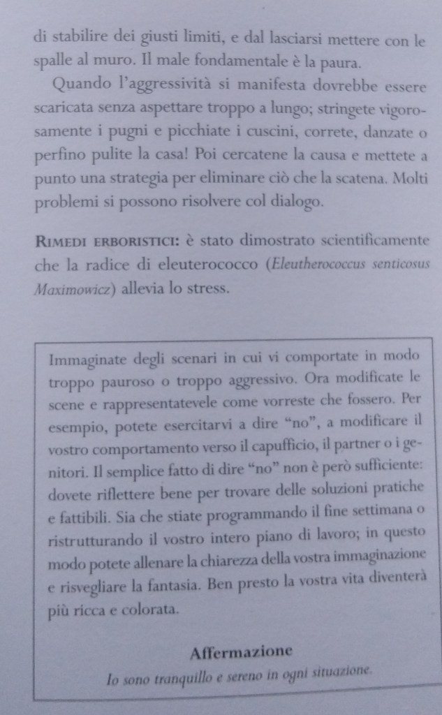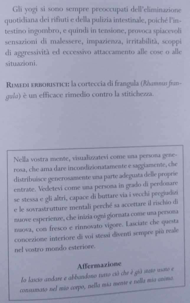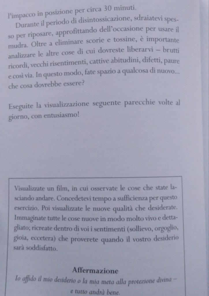 Dobbiamo essere disposti a lasciar andare tutto ciò che ci fa stare male. Gli sciamani dei popoli nativi cominciano sempre i loro rituali di guarigione scacciando gli spiriti cattivi. Considerate quello che vi fa star male: quali sono i pensieri, i sentimenti e le abitudini che minano la vostra salute? Siete pronti ad abbandonarli? Tuttavia non dimenticare l’amore, la cura e la comprensione per voi stessi: più sbagliate, più avete bisogno di amarvi.