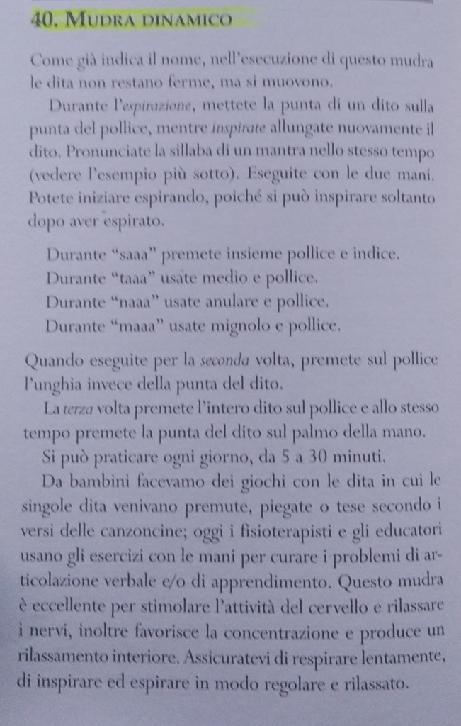 - Quando praticate un mudra per calmarvi, dovete rallentare la respirazione. Quando praticate un mudra per rigenerare le energie, dovete intensificare la respirazione. La qualità ottimale della respirazione si raggiunge quando il respiro è lento, profondo, ritmico, agevole.